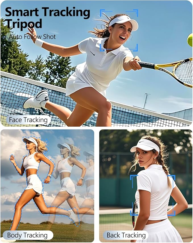 - 【360° AI Face Tracking – Smart Auto Framing】Equipped with AI-powered motion tracking, this tripod automatically detects and follows your face or body as you move—no app required. Its 360° rotation ensures you're always perfectly centered, ideal for live streams, video calls, and content creation.