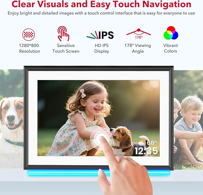 - 10.1 Inch IPS HD Touchscreen: This smart picture frame has a high-definition display with a resolution of 1280x800, allowing you to enjoy the most precious moments with a 180° wide viewing angle and accurate color reproduction. The user-friendly touch screen design makes sharing especially easy for older adults. With just a touch, you can quickly browse photos, adjust brightness and sound, play slideshows, and more