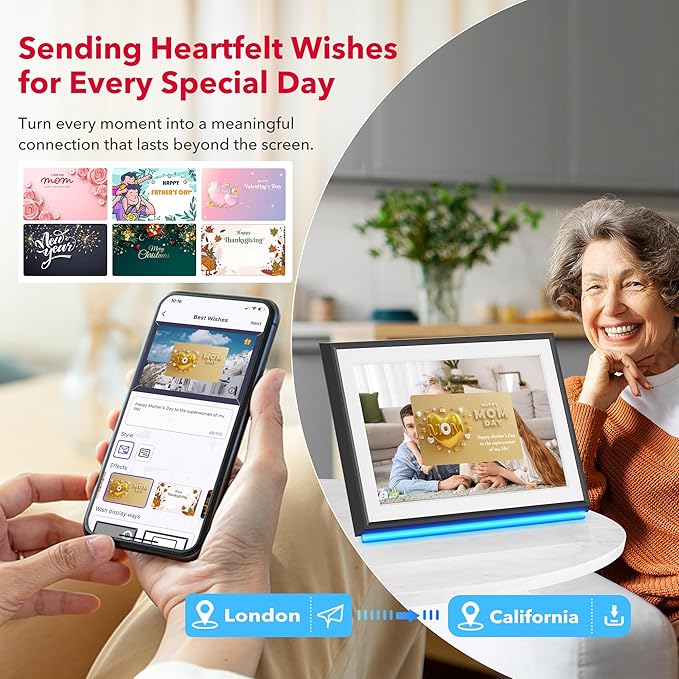 - Unlimited User Connections: With unlimited users, you can invite friends and loved ones to connect with the electronic picture frame, then effortlessly share your most cherished moments through the smart cloud frame. Moreover, the photo frame features a unique option that enables connected users to send personalized greetings directly to the 10.1inch digital frames via the Uhale App for special occasions, such as Christmas, Thanksgiving, Valentine’s Day, and Mother’s Day.