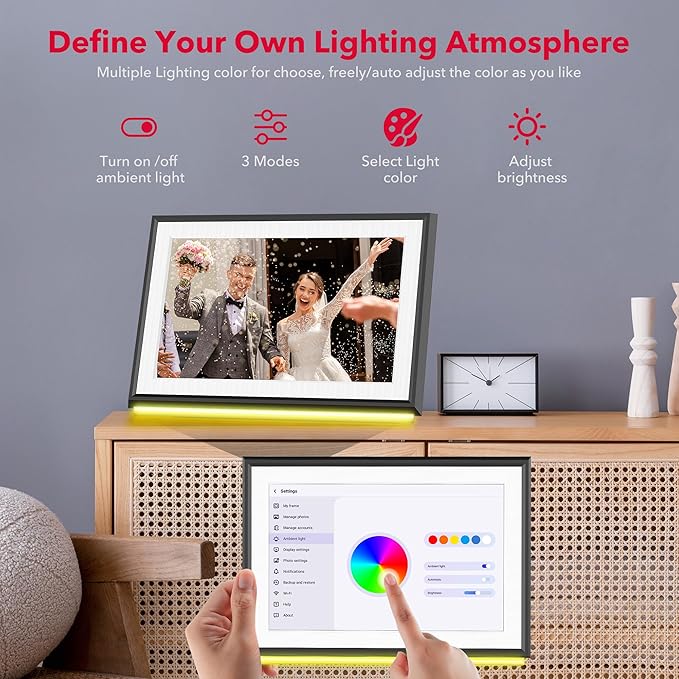 - AI-Powered Neon Light Design: Elevate your viewing experience with the RCA Digital Picture Frame’s AI Lighting Technology. It features multiple LED modes with over 16 million color variations, allowing you to customize the look and feel of your photos to match your mood. Whether showcasing vibrant landscapes or tender family moments, the Uhale photo frame enhances every image.