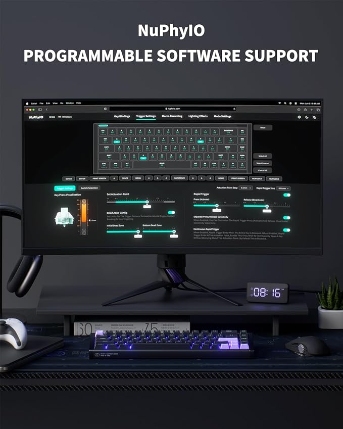 - NuPhyIO Self-Developed Driver: You can easily customize your BH65 game keyboard through NuPhyIO. From key remapping to macro creation, actuation point adjustments, and rapid triggering setup, access everything you need from any browser—anytime, anywhere—for a truly personalized setup