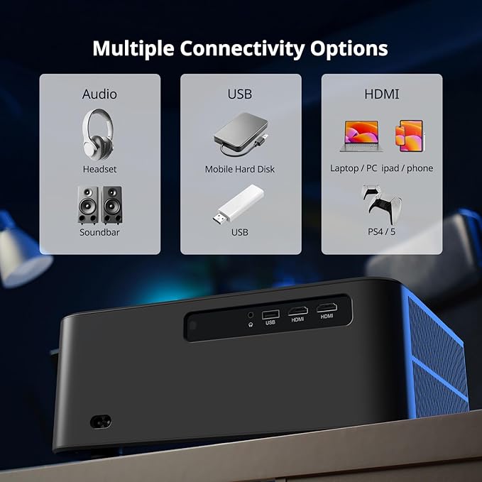 - MULTIPLE INTERFACES, VERSATILE PROJECTION MODES:The WEWATCH WP01 ceiling projector offers versatile connectivity with 2 HDMI ports, 1 USB port, and 1 Audio Out, allowing seamless connection to various devices. It supports multiple projection modes, including Front Desktop, Rear Desktop, Rear Ceiling, and Front Ceiling, giving you flexibility to set up the projector in any space or orientation. Whether for home theaters, presentations, or entertainment, this portable projector adapts to your needs for an easy and customizable viewing experience.