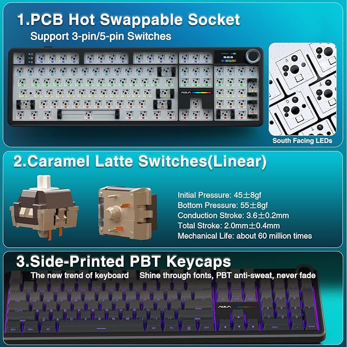 - Smart Display Screen & Multi-function Knob: AULA F108 Pro wireless mechanical keyboard has built-in intelligent TFT color display screen, which can be used as an interactive interface for real-time updating and customization. The high-definition display and multi-function knobs are designed to make it easy to switch and update custom Gif images, volume, date and time, battery status, backlight and connection modes for greater ease of use(Note: You need to download the software under windows system and keep in wired mode to set the screen image/GIF, calibrate the date and time. The screen has a transparent protective film that can be torn off for use)