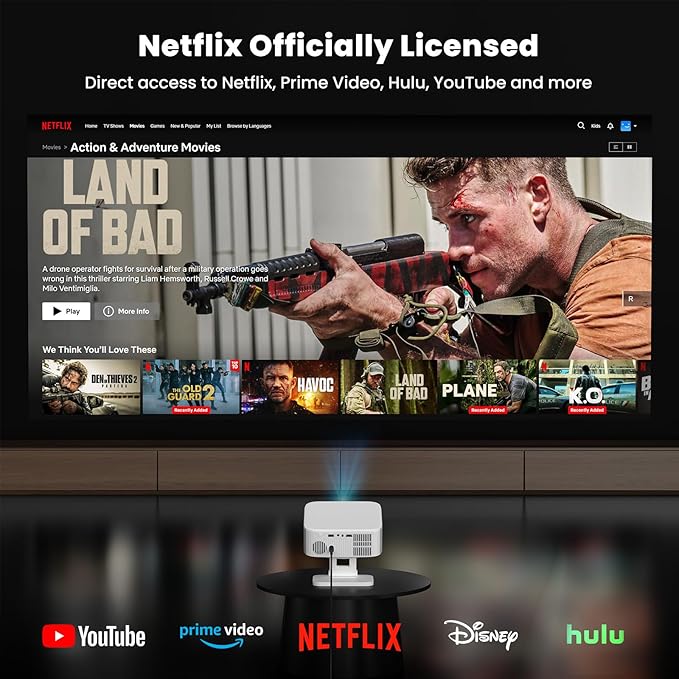- [Netflix Officially Licensed - Global Entertainment at Your Fingertips] This home theater projector comes with the official Netflix app pre-installed, allowing you to start streaming right away without an TV stick or complex setups. Enjoy seamless access to thousands of titles with automatic app updates for ongoing performance and security. Whether you're at home, camping, or in your dorm, get on-demand entertainment anywhere, anytime.