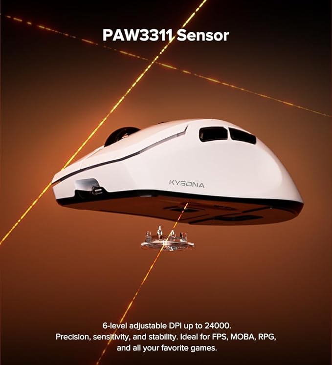 - PixArt PAW 3311: High-performance optical sensor and 6 DPI settings, reaching up to 24,000, the mouse ensures precise tracking in any game. Whether you're headshotting enemies in an FPS or making split-second tactical maneuvers in an RTS, the 3311 sensor guarantees accurate tracking with zero jitter or stutter, allowing you to hit every target with deadly precision