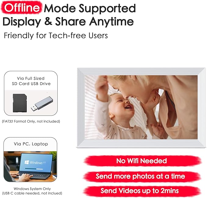 - No WiFi? No Problem! If connecting to WiFi or using apps feels tricky for you or your loved ones, donāt stress! Our 15.6 inch large Frameo digital frame support non-wifi transmissionājust pop in a full-sized SD card or USB drive (FAT32 format), or connect via USB-C cable to transfer photos from a computer, you may send pictures and videos to the digital frame even with no wifi connected. Perfect for grandparents or anyone who prefers a simpler setup! Supports JPG/JPEG/BMP/PNG images, MP4 videos
