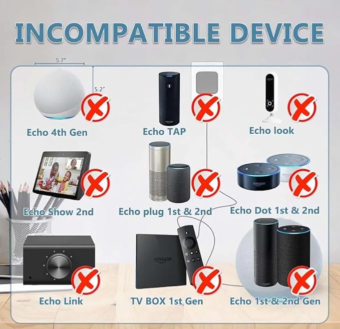 - Compatible Devices : Echo Dot 3rd generation, Echo Dot 4th generation, Echo Dot with Clock, Echo Dot (3rd/4th Gen) Kids Edition, Echo Show 5(Not work with Echo show 5 3rd Generation), Echo Spot, Fire TV Cube Echo Dot 3rd generation, Echo Dot 4th generation, Echo Dot with Clock, Echo Dot (3rd/4th Gen) Kids Edition, Echo Show 5(Not work with Echo show 5 3rd Generation), Echo Spot, Fire TV Cube