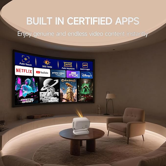 - 【Built-in android OS and Electric Focus】Built-in android operation system with app store for 10000+ apps installation to seamlessly enjoy a various of video at home. electric focus feature is convenient for effortless correcting images after power on the projector in 3 seconds. Simply press the focus ± button on the remote control to obtain a clear image, instead of manually adjusting the focus ring on the projector