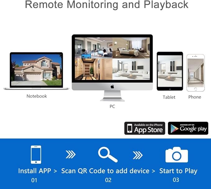 - Remote Viewing: Firstrend wireless camera system supports remote viewing and playback via smartphone (iOS/Android), tablet, and PC. Download the free app and ensure DVR is connected to your router. Features include motion detection, email/app alerts, video backup, and multi-channel playback.