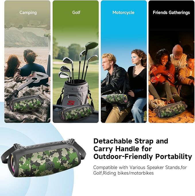- IPX7 Waterproof & Detachable Strap – Adventure-Ready Design Splash-proof ABS + rubber casing survives beach days, hikes, or sudden rain (do not submerge). The detachable strap lets you hang it on bikes, backpacks, or tents—take your portable outdoor speaker anywhere