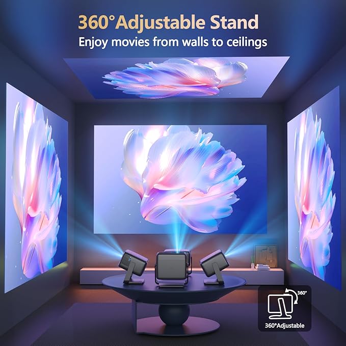 - 2000 ANSI Lumens Ultra-Bright & 360°Rotatable Stand– With upgrade 2000 ANSI lumens of brightness, enjoy vivid, true 4k cinematic viewing anytime, even in daylight. Perfect for rooms with some light or outdoor movie nights without compromising image clarity. Plus, our exclusive 360° rotatable stand lets you pivot from wall to ceiling projection in seconds. Perfect for versatile setups, whether you're gaming, bedtime stargazing, or presenting