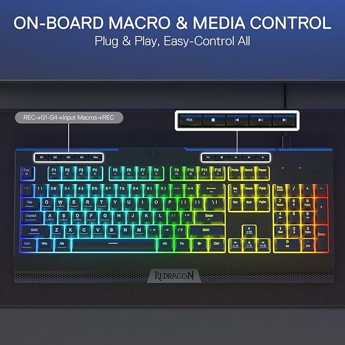 Redragon K525 RGB Backlit 104 Keys Wired Membrane Gaming Keyboard w/ 5 Multimedia Keys & 4 Extra On-Board Macro Keys, Dedicated Media Control, Ergonomic Wrist Rest, Linear Mechanical-Feel Switch