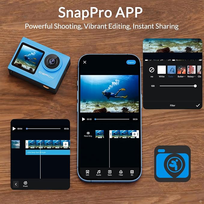 - 【Powerful APP Functions】Connect the camera to the Snap-Pro APP via WiFi, and easily import and export images and videos. The APP's video editing feature offers a wealth of tools and materials. Users can import background music, add subtitles, select filters and backgrounds, and preview the editing effects, meeting diverse creative needs.