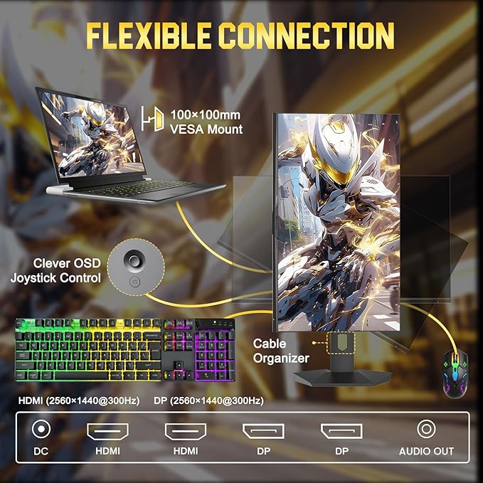 - Multiple Ports - 2× HDMI 2.1 ports plus 2× DP 1.4 ports, both up to 300Hz refresh rate; One DP cable included in the package; Audio Jack (no built-in speakers); VESA 100mm*100mm