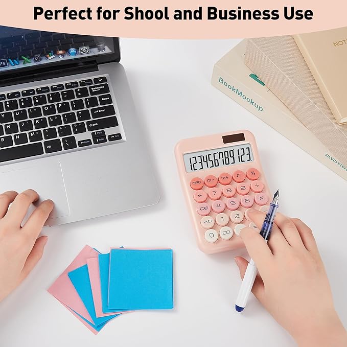 - Stylish & Multi-Functional: This pink calculator features a vibrant, pink cute design that adds personality to your workspace and makes it easy to spot on your desk. It is compact enough to fit in your hand, bag, or drawer—ideal for on-the-go use. Despite its small size, it’s packed with all the essential functions, including addition, subtraction, multiplication, division, percentage, backspace, CE, memory functions (M+/M-/MRC), and ON/AC buttons to handle everyday calculations with ease