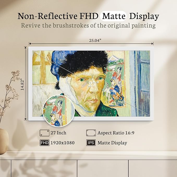 - 27 Inch FHD Matte Screen and Large Memory: BSIMB digital picture frame featured with 27 Inch 1920x1080 FHD IPS screen and an aspect ratio of 16:9, the digital photo frame displays stunning and clear images, which can revive the brushstrokes of the original painting. The digital frame built-in 32GB internal storage (holds 80,000+ pictures) with support for Micro SD Card (TF Card) and USB drive. The digital picture frames also with a remote control making it perfect for older or less tech-savvy people to operate. NOTE:The battery type for this remote is AAA+, not included in the package.