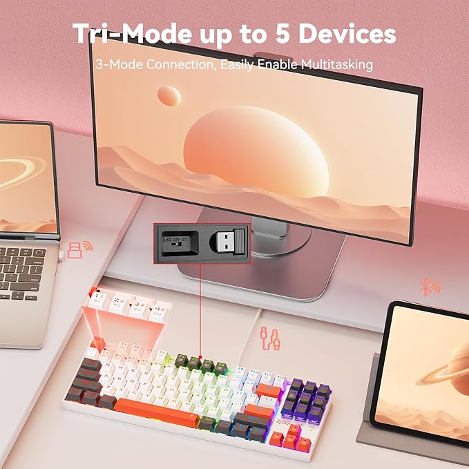 - 【Tri-Mode up 5 Devices】2.4G Wireless/Bluetooth/Wired, the mode button can easily switch 3 Connection Methods to meet your multi-device multitasking needs. And Redragon mechanical keyboard provides 10m stable and efficient transmission, ensuring your free gaming.