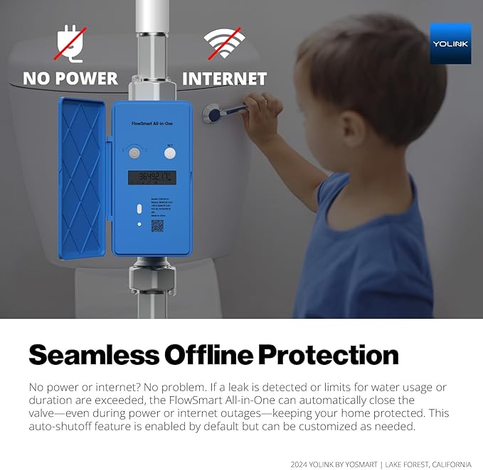 - Seamless Offline Protection: No power or internet? No problem. If a leak is detected or limits for water usage or duration are exceeded, the FlowSmart All-in-One can automatically close the valve—even during power or internet outages—keeping your home protected. This auto-shutoff feature is enabled by default but can be customized as needed.