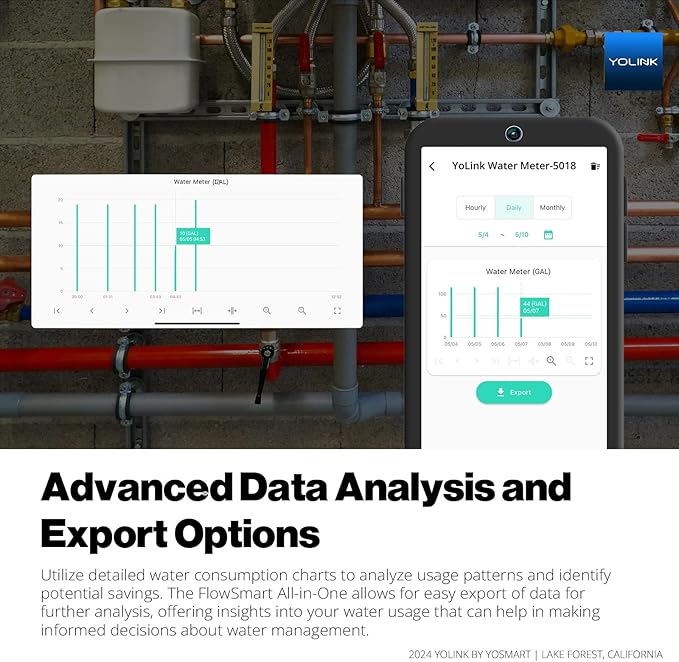 - Advanced Data Analysis and Export Options: Utilize detailed water consumption charts to analyze usage patterns and identify potential savings. The FlowSmart All-in-One allows for easy export of data for further analysis, offering insights into your water usage that can help in making informed decisions about water management.