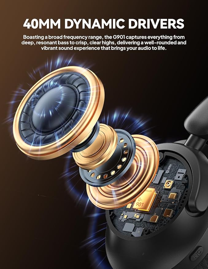 - Music Enjoy with Deep Bass: Equipped with custom 40mm dynamic drivers, G901 over-ear headphones deliver High-quality audio with balanced deep bass and crisp highs. Whether wireless or wired (via 3.5mm AUX), enjoy studio-quality sound with enhanced clarity and detail, perfect for music, movies, and gaming