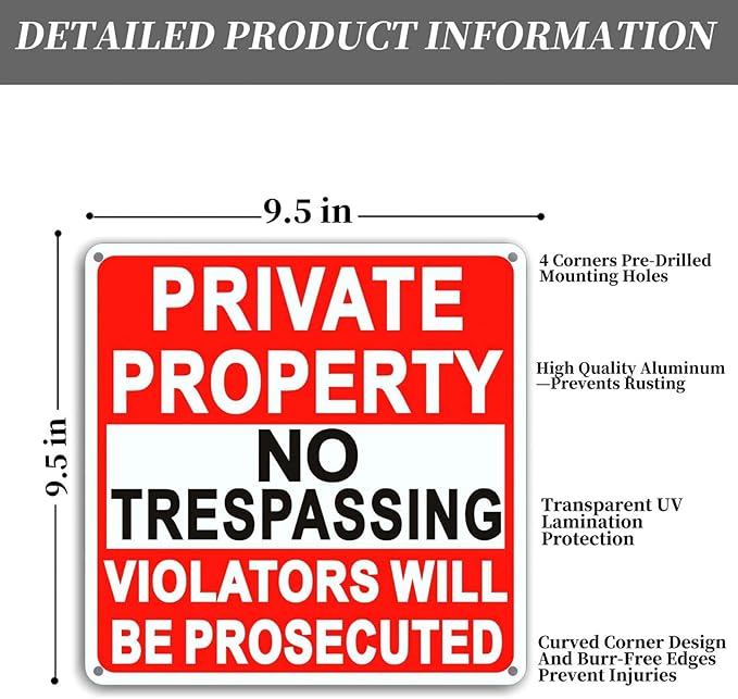 - 1.【LONG OUTDOOR SERVICE LIFE】:The Private Property No Trespassing Sign Is Made Of Rust-Proof Aluminium With Reflective Coating And Uv Coating. The High Quality Material And Advanced Production Process Ensure That The Security Signs Are Durable For Outdoor Use For A Long Time Without Fading.