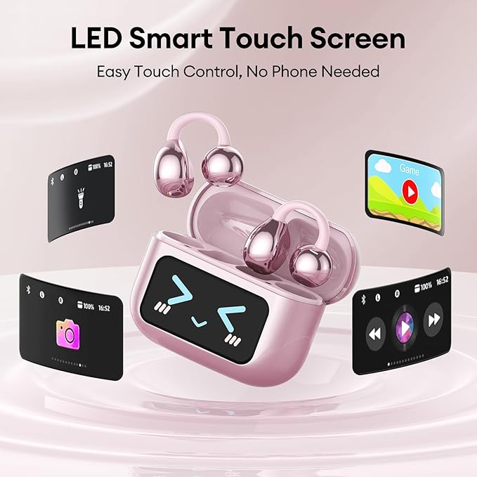 - Command Your World with the 1.3" Touchscreen Case: Skip tracks, snap Instagram-worthy selfies (Android/iOS), and crush mini-games—all from your ear clip earbuds’ case! Ditch your phone during workouts, travels, or boring meetings—ultimate control stays in your pocket