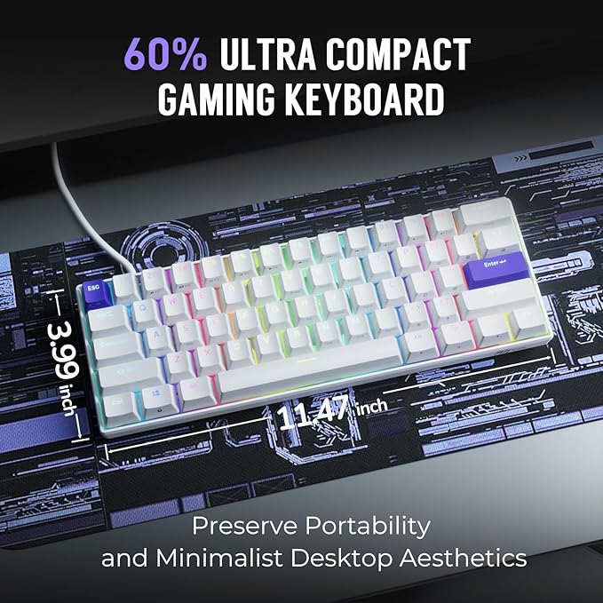 - Ultra Compact 60 Percent Layout: The 60% gaming keyboard supports more flexible hand movement without number pad, reducing accidental keypresse during gameplay; With features like full-key anti-ghosting, it can meet gamer's fast input needs and enhance the overall gaming experience