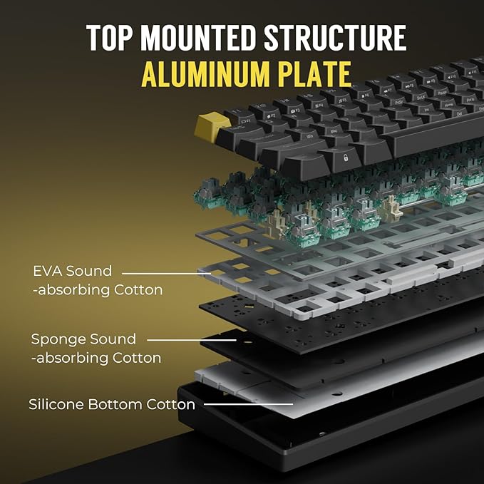 - Top Mount Gaming Keyboard: Featuring an aluminum alloy positioning plate, the top structure guarantees the clarity of key actuation feedback; Silicone pad and bottom damping cotton effectively reduces noise; In esports, gamers detect triggers precisely with clear operational feedback