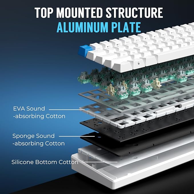 - Top Mount Gaming Keyboard: Featuring an aluminum alloy positioning plate, the top structure guarantees the clarity of key actuation feedback; Silicone pad and bottom damping cotton effectively reduces noise; In esports, gamers detect triggers precisely with clear operational feedback