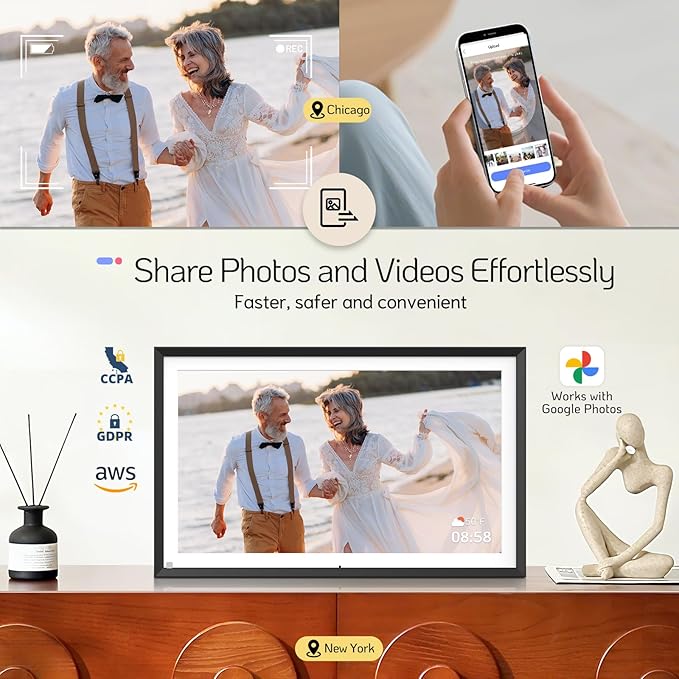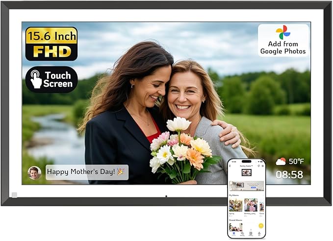 NexFoto 15.6 Inch Touchscreen Digital Picture Frame 64GB, FHD IPS WiFi Digital Photo Frame, Add Photos from Google Photos, Share Photos/Videos via App/USB, Gifts for Birthday/Mom/Women, Black