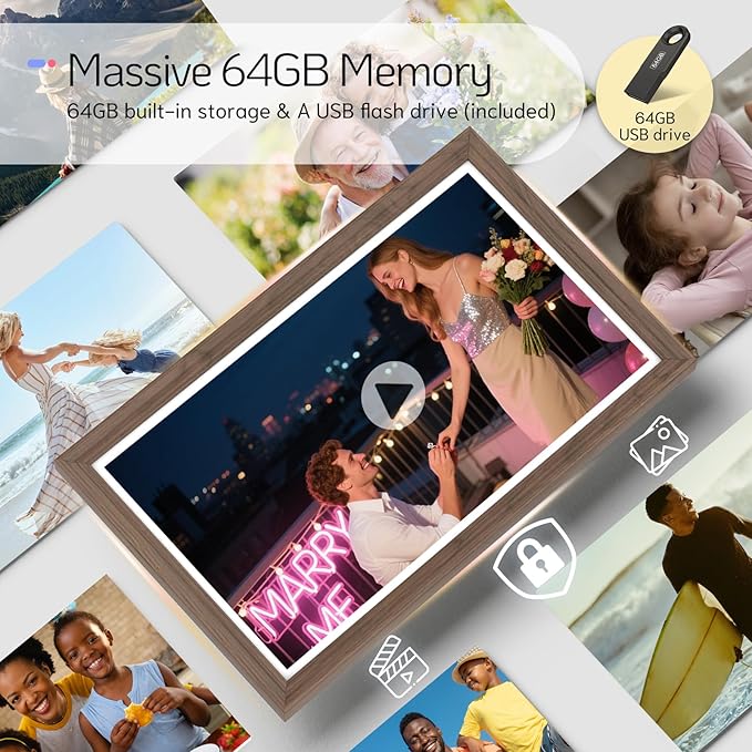 - 27 inch Touch Screen and 64GB Memory: The NexFoto 27-inch digital photo frame features 1920 x 1080 FHD Glossy Touch Screen (aspect ratio 16:9) that showcases your memories in vibrant colors and sharp details, while the IPS display technology brings much wider viewing angles. This digital picture frame features 64GB internal memory, and it supports mirco SD card extended storage (up to 64GB, not included). Enjoy cloud-based storage convenience, absolute privacy and security. Besides, we give you a USB flash drive.