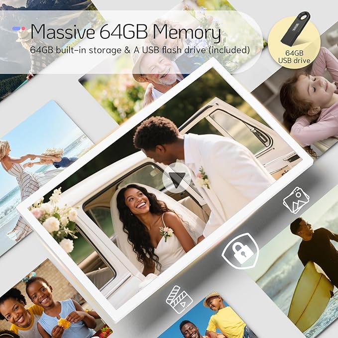 - 24 inch Touch Screen and 64GB Memory: The NexFoto 24-inch digital photo frame features 1920 x 1080 FHD Glossy Touch Screen (aspect ratio 16:9) that showcases your memories in vibrant colors and sharp details, while the IPS display technology brings much wider viewing angles. This digital picture frame features 64GB internal memory, and it supports mirco SD card extended storage (up to 64GB, not included). Enjoy cloud-based storage convenience, absolute privacy and security. Besides, we give you a USB flash drive