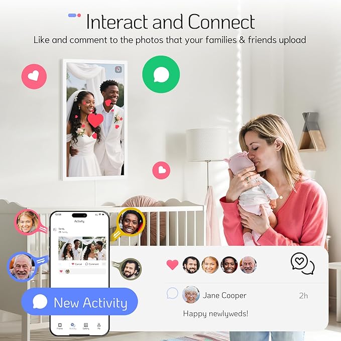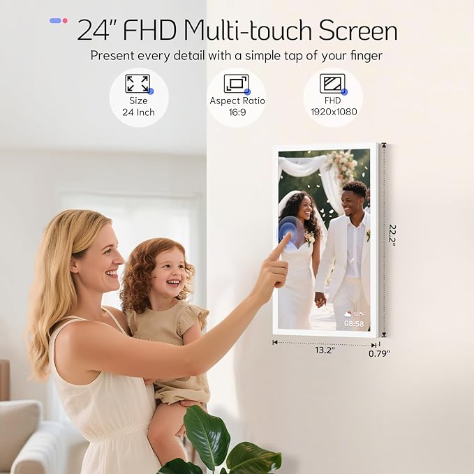NexFoto 24 Inch Touchscreen Digital Picture Frame Large, FHD WiFi Electronic Photo Frame 64GB, Add Photos from Google Photos, Videos via App/USB, Gifts for WWedding, Newlywed, Housewarming, White