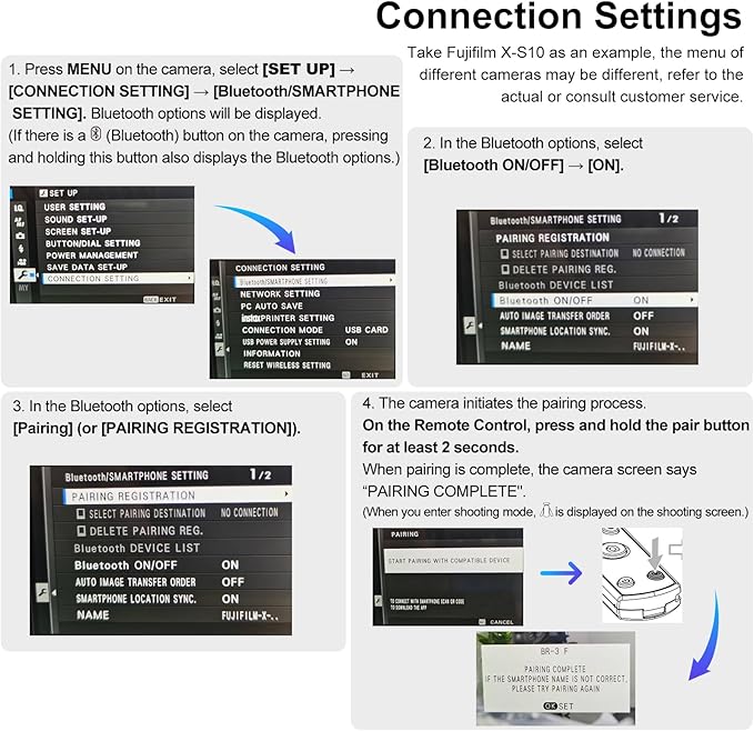 - Compatible with Multiple Models: The AODELAN camera wireless shutter release is compatible with Fujifilm X-H2S,X-H2,X-T5,X-T4,X-T3,X-S20,X-S10,X-T50,X-T30 II,X-T30,X-M5,X100VI,X-E5,X half; -Compatible models and the firmware versions are X-H2S (Ver.3.00 or later),X-H2 (Ver.1.20 or later); X-T5 (Ver.1.00 or later), X-T4 (Ver.1.70 or later); X-T3 (Ver.4.50 or later),X-S10 (Ver.2.60 or later); X-T30II (Ver.1.20 or later),X-T30 (Ver.1.50 or later). Remote zoom is only available with zoom lenses.(Even with a zoom lens, the X-T30 II/X-T30/X100Vl does not support remote zoom for the time being.)