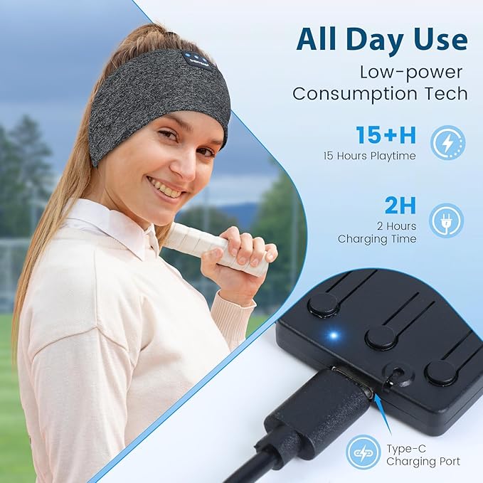- 【Fast Charging】This Bluetooth sleeping headband has a built-in powerful battery chip and uses a USB C charging port. It only takes 1~2 hours to fully charge. The call/music playback time can reach 15+ hours, which is enough to support long-term exercise such as hiking and mountaineering. The removable and washable Bluetooth sleeping headset music headband is easier to store and clean.
