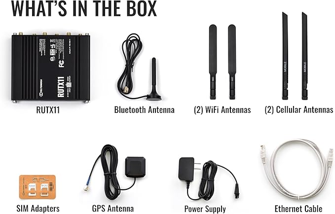 - Included Components : Router, 2 x WiFi antennas, 1 x GNSS Antenna, 2 x Mobile Antennas, 1 x Bluetooth Antenna, Power Supply, Ethernet Cable, SIM Adapter Kit Router, 2 x WiFi antennas, 1 x GNSS Antenna, 2 x Mobile Antennas, 1 x Bluetooth Antenna, Power Supply, Ethernet Cable, SIM Adapter Kit
