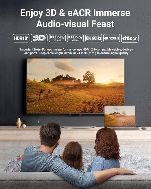 - HIGH-RESOLUTION HDMI 2.1 CABLE: This HDMI Adapter Cable supports resolutions up to 7680 x 4320, 8K@60Hz, 4K@120Hz/144Hz, HDCP 2.2/2.3, and dynamic HDR,which brings you more precise details and more realistic and sharper images. With a data transmission speed of up to 48Gbps, it supports VRR and QFT functions, ensuring a smooth and immersive experience. HDMI 2.1 version is backward compatible with HDMI 2.0/1.4, enabling long-distance synchronization of video and audio signals.