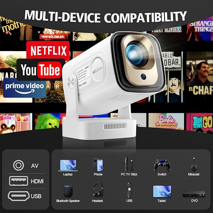 - Auto-Focus & Auto Keystone Correction --- Enjoy instant sharpness with auto-focus and auto vertical keystone. No manual adjustments needed,The built-in application ecosystem continues to expand, enjoying Netflix/Prime Video/YouTube and other platforms with more than 500,000 film and television resources, and the intelligent experience is fully evolved.