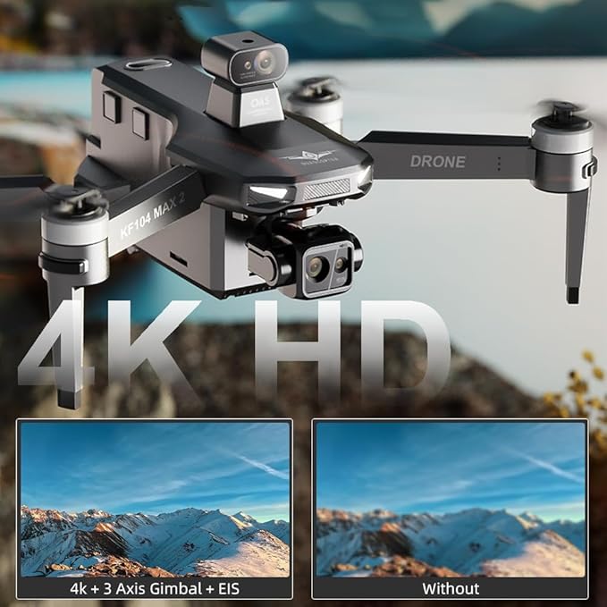 - 【4K HD Camera + 3-Axis Gimbal】KF104 The MAX2 drone is equipped with an upgraded 4K HD camera lens, which clearly reproduces beautiful pictures and records the good landscape around you all the time. The drone is equipped with wide angle shooting/lens adjustment/three-axis gimbal self-stabilization function. No matter day or night, the field of view is stabilized and the images are high-definition.