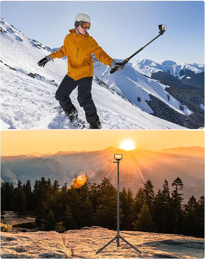 - Selfie Stick + Tripod 2-in-1 Design: Can be used as a hand grip for action cameras, an handheld extension rod, a telescopic selfie stick, or unfold the built-in tripod for fixed point shooting. Perfect for capturing landscapes, vlogs, skiing, selfies, or travel diaries.