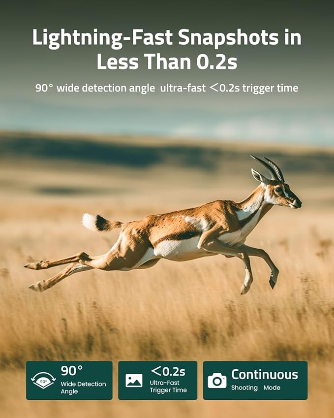 - FIRST-CLASS TRIGGER SPEED: With a trigger time under 0.2 seconds, a 90° detection angle, and the continuous shooting mode that snaps 1 to 3 shots, it quickly captures the footage you need. It detects people, vehicle, and animals, reducing false alarms and helping you find the right clips fast. The built-in GPS ensures easy tracking, so you don’t worry about loss or theft.