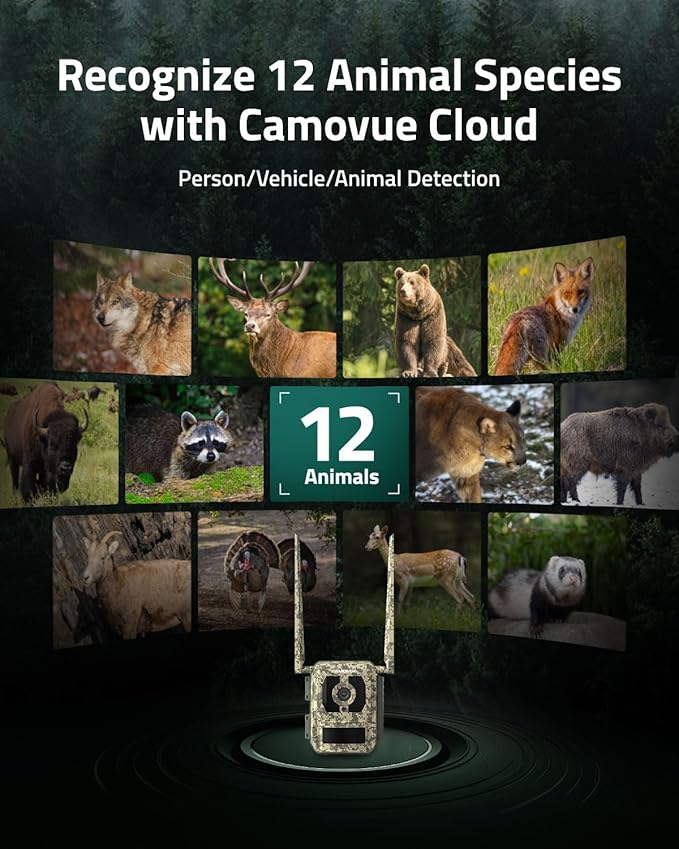 - 4G LTE CONNECTION + LIVE STREAMING: Experience live streaming remotely with this 4G LTE wildlife camera. Easily configure and control the camera anytime from anywhere on the Camovue App. With a SIM card included, it automatically connects to the strongest available network, ensuring stable and reliable connectivity.