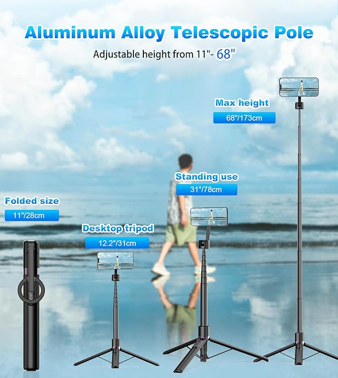 - 3 in 1/Easy to Use - Selfie stick tripod is designed with one-touch unlocking, just press the button on the bottom of tripod and pull telescopic rod. Selfie stick consists of 8 sections of retractable rods, height can be adjusted from 10.8in to 68in, magnetic phone tripod mount ring can hold up to 500g, and can be flexible to take great photos at different heights. You also can switch between desktop tripod, floor tripod and selfie stick modes to easily meet your different shooting needs.