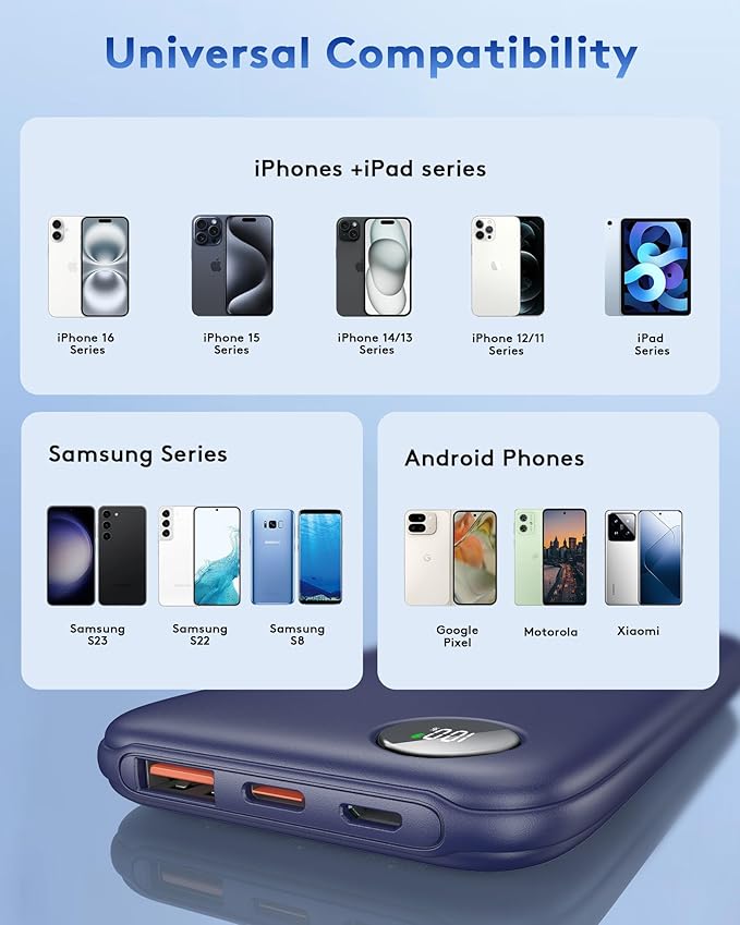 - 🔋 More Comprehensive Phone Battery Bank: Compatible with all smartphones, including the entire series of iPhone 16/15/14/13/12/11/X/8, Samsung, Google, Android, and more. It can charge the iPhone 16 twice, iPhone 12 2.3 times. It's sufficient to meet your daily needs.(This product only includes one Type-C charging cable and does not come with a Lightning charging cable.)