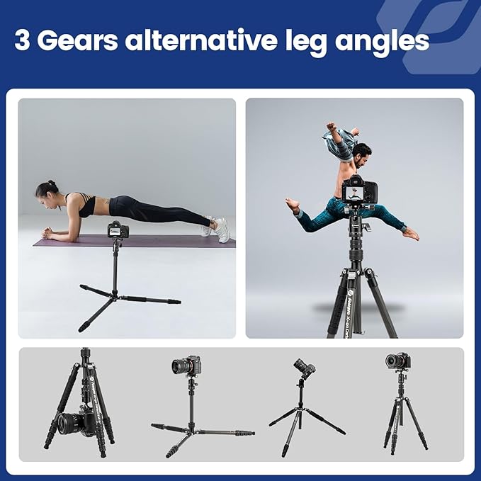 - Adjustable Heights for Various Adaptations:The carbon fiber tripod allows height and leg angle adjustments. With 4-section legs with twist locks, the tripod can extend from 14.1 inches to 60 inches (36cm to 152 cm) in seconds, providing heights to meet most photography needs. The tripod legs can be adjusted in three levels, allowing photographers to shoot from various angles and positions. This feature is particularly useful in landscape and wildlife photography, where the terrain may be uneven or sloped.