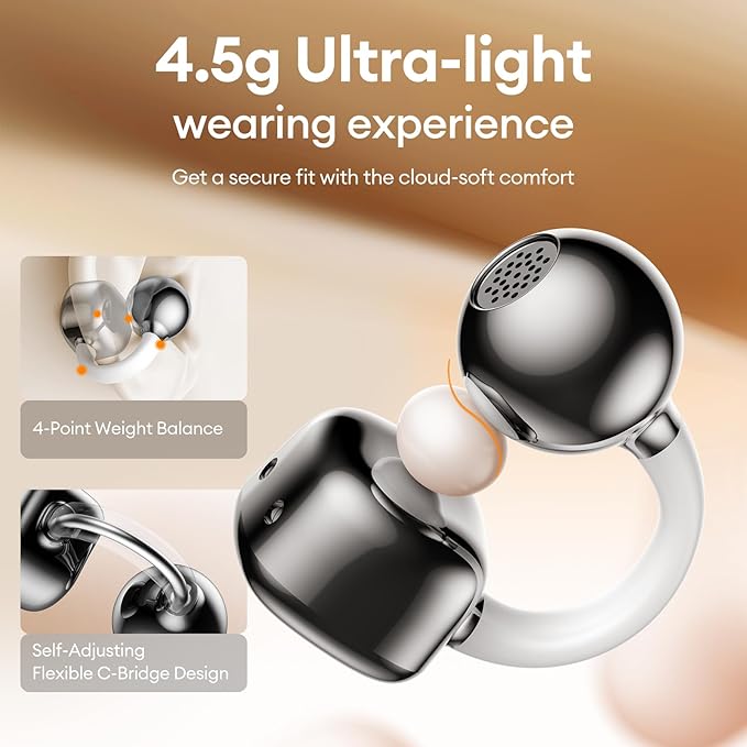 - 【IP45 Waterproof & Sweatproof】The clip on ear headphones feature IP45 dust/water resistance and nano hydrophobic coating to withstand rain, sweat, and dust. Perfect for running, cycling, hiking, and workouts—they stay secure and perform flawlessly no matter how hard you push, ideal for intense gym sessions, trail running, or outdoor adventures—no worries about damage from extreme conditions.