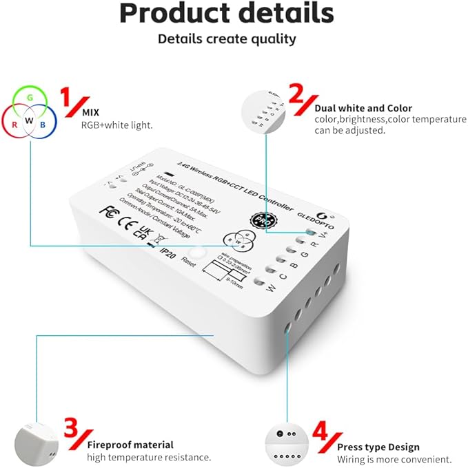 - Seamless RGB + CCT Mixing: Combines RGB color and tunable white light (2700K-6500K) for endless lighting possibilities, allowing smooth transitions and custom ambiance