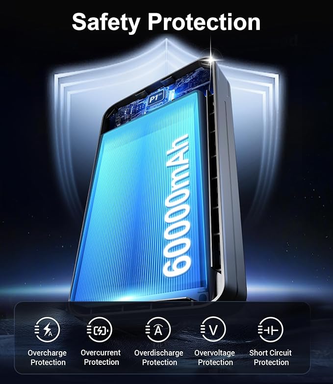 - [Incredibly Compact Design]: 60,000mAh battery in a <1lb (15.5oz) frame—scarcely thicker than 4 stacked phones, tucks easily into your backpack. Its premium reinforced shell, glass-fiber-reinforced ABS+PC alloy, resists impacts and scratches with a textured finish: no scuffs, no slips, just a solid grip. The perfect on-the-go partner for commutes, campus, and outdoor trips.