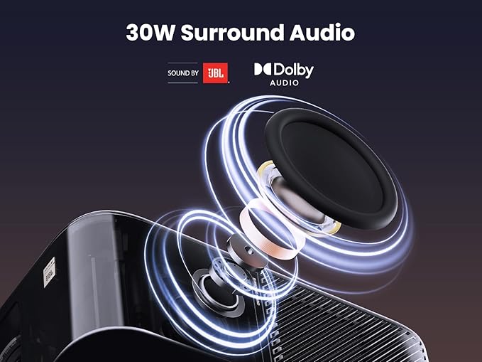 - 【30W JBL Surround Sound & Dolby Audio】The K3 Pro boasts built-in audio system with dual 15W JBL speakers and Dolby Audio creates an immersive theatre-like soundscape.This sound system features NdFeB full-range drivers, meticulously crafted exclusively for the Yaber K3 Pro, accompanied by a passive radiator designed to enhance low-frequency efficiency and a finely calibrated audio DSP. The result is a symphony of astonishing mid-range clarity, sumptuous bass, and delicate treble.