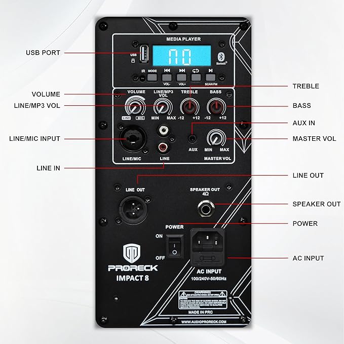 - ποΈ Professional Control Panel: Proreck IMPACT 8 Speaker have Separate volume controls for music/mic, Remote access to all main functions. Ideal for mobile entertainers and events.